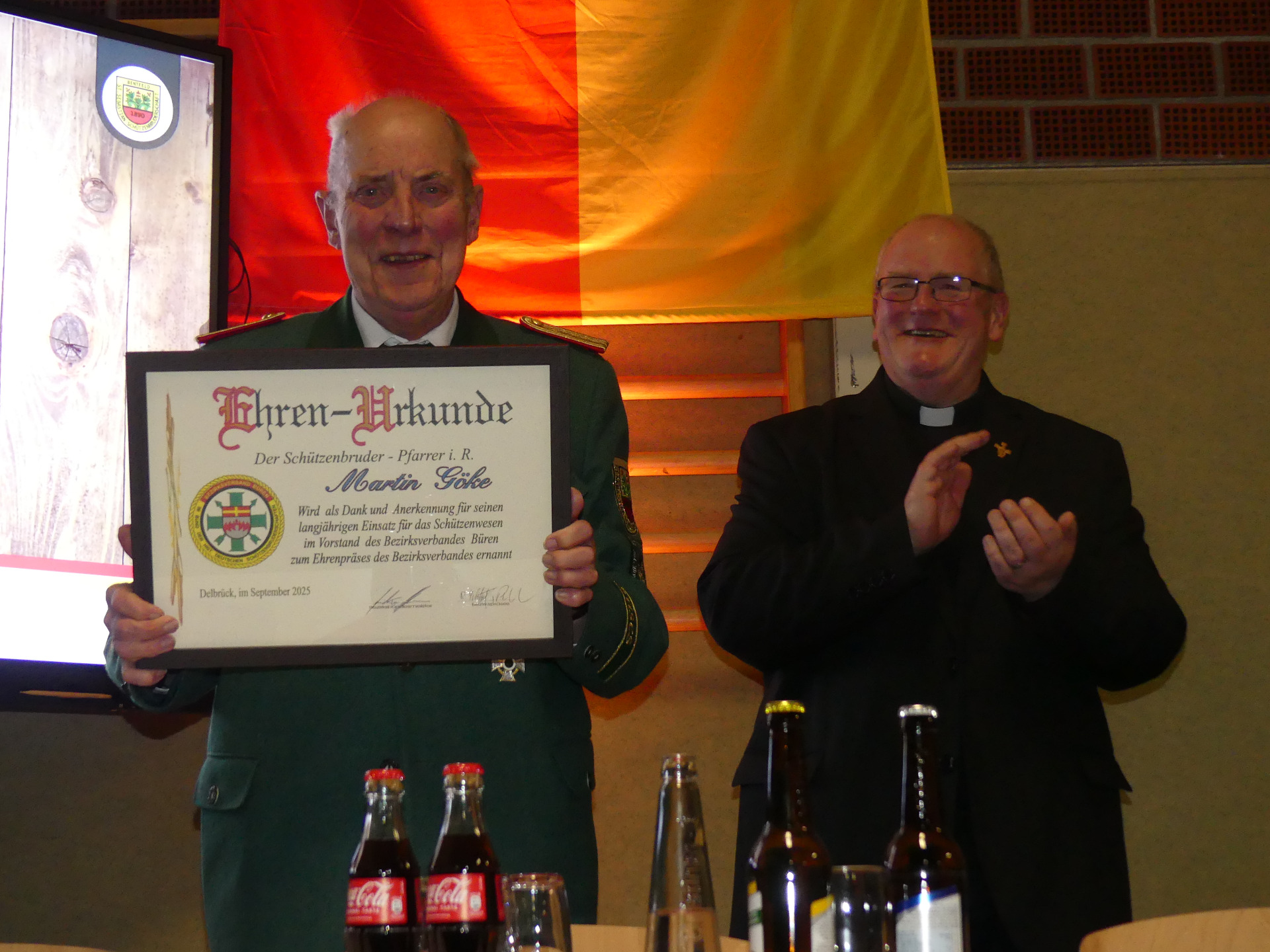 Dieser Bezirksverbandstag in Bentfeld am 27. September 2025 war etwas besonderes, da nicht nur die neuen Bezirkskönige ermittelt wurden sondern auch die Übergabe des Amtes als Bezirkspräses von Martin Göke (Anreppen) an Raphael Schliebs (Haaren) sowie die Verleihung einer der höchsten Auszeichnungen des BHDS an Werner Peitz stattfanden.