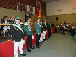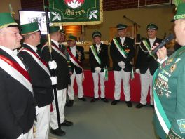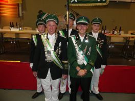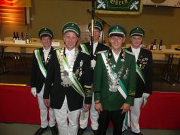 vorn v.l.: Bezirksschießmeister Christopher Scharfen, Bezirkskönig Sebastian Köster (Niederntudorf), Bezirksbundesmeister Guido Topmöller, Bezirkskönig Daniel Gödde, stellv. Bezirksbundesmeister Jörg Waltemate, stellv. Bezirksschießmeister Joel Janzen